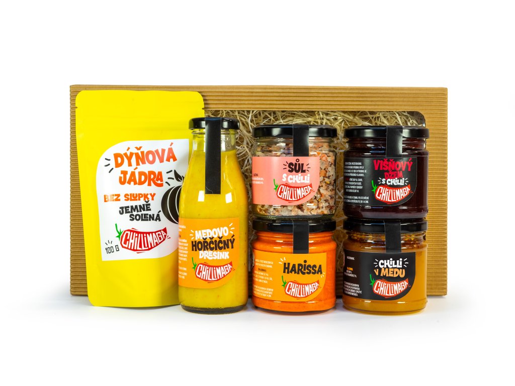 Dýňová jádra nepikantní, medovo-hořčičný dresink, sůl s chilli, chilli v medu, harissa a višňový džem s chilli a Dárková krabička vybersisám - velká