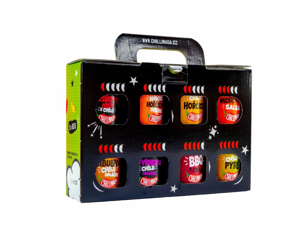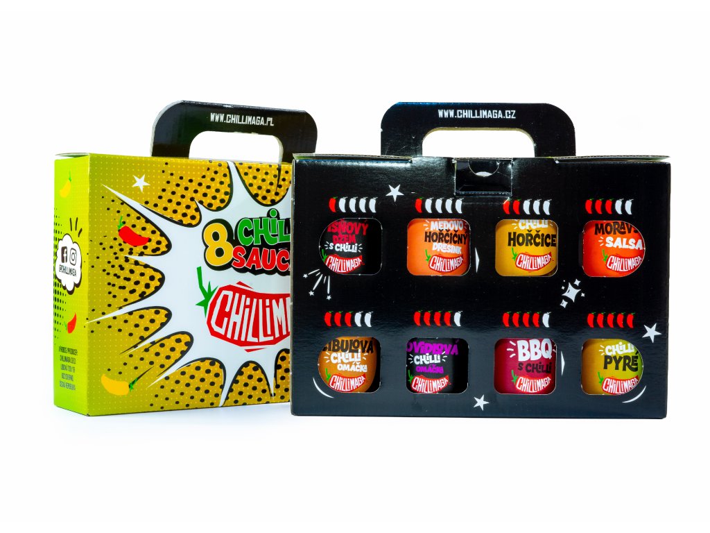 Rozhodovat se, kterou omáčku vzít, je někdy peklo. Tak proč ne všechny najednou? Připravili jsme pro vás krásnou dárkovou krabičku s osmi našimi vychytanými produkty – sladké, pikantní, jemné i drsnější, všechno pěkně pohromadě. Perfektní dárek pro všechny, kdo chtějí ochutnat pestrost ChilliMagy.