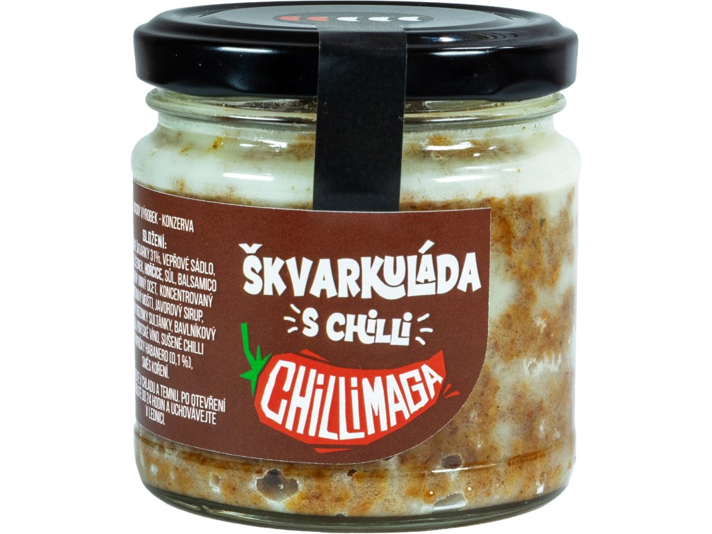 Složení: Vepřové škvarky 31 %, vepřové sádlo, cibule, česnek, hořčice, sůl, balsamico (červený vinný ocet, koncentrovaný hroznový mošt), javorový sirup, rozinky (rozinky sultánky, bavlníkový olej), portské víno, sušené chilli papričky Habanero (0,1 %), směs koření.
